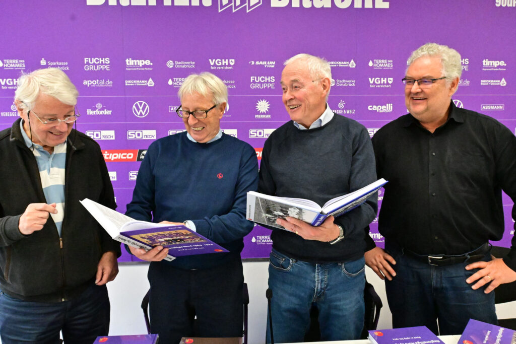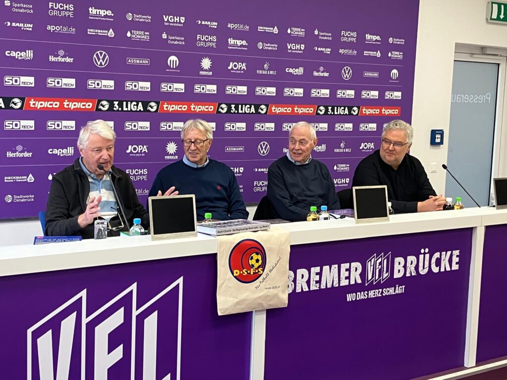 Harald Igel berichtete über die langjährigen Recherchen an diesem Buch und seinen Bezug insbesondere zu den Hamburger Mannschaften der RL Nord. Ralf Hohmann stellte heraus, mit welchen Intention und Motivation der Verein solche umfangreichen Projekte initiiert und machte in diesem Zusammenhang besonders die Chronistenrolle des DSFS deutlich. Anschließend wurden den beiden VfL-Legenden jeweils beide Bände zur Regionalliga Nord-Chronik überreicht. Beide waren sichtlich erfreut und berichteten von Anekdoten aus ihrer aktiven Zeit.