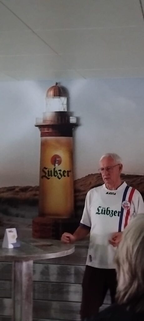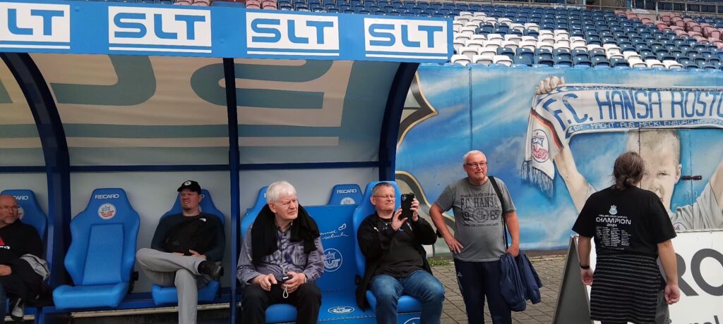 Die äußerst interessante Stadionführung begann um 11:30 Uhr. Unser Stadionguide führte uns über alle Tribünen, durch fast alle Gänge und durch eine Vielzahl von Räumen. Wir bekamen umfangreiche Einblicke in die Geschichte des Stadions. Als Städtisches Stadion Cottbus wurde es 1930 eingeweiht, von 1950 bis 2023 Stadion der Freundschaft (niedersorbisch Stadion pśijaśelstwa). Heute hat es eine Kapazität von 22.528 Plätzen.