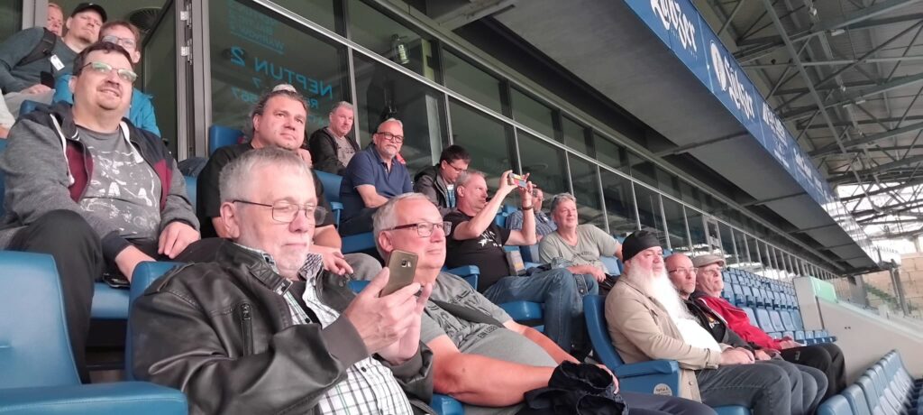 Gegen 14:00 Uhr waren wir wieder in der Lounge des Stadions, um mit der Sitzung zu beginnen. Helmut Morgenweg (Leipzig) und Maik Thiem (Kirschau) warteten schon auf uns. Wir diskutierten konstruktiv über die geplanten Tagungsordnungspunkte: Zuständigkeiten Projekte Nordost, Stand Datenbank, Stand Nordost-Almanach 22/23, Stand Chronik Berlin [West], Stand FDGB-Pokal. Detaillierte Informationen dazu (auch weitere Fotos) im nächsten Magazin. Um 18:00 Uhr beendeten wir die Sitzung.